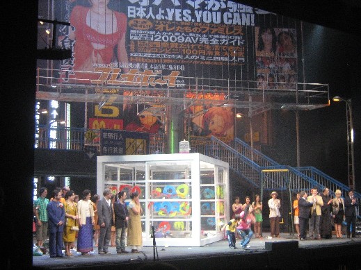 Iniziamo la nostra analisi dalla parte visiva dello spettacolo che si basava su un allestimento di Aldo Rossi, molto conosciuto perch? utilizzato spesso nei teatri d?opera. E? costruito su un impianto scenico a pi? piani, piuttosto scarno, la cui visone d?insieme richiama pi? le caratteristiche di un centro commerciale che l?esotismo giapponese. Fortunatamente i bei costumi di Anna Maria Heinreich e la regia di Stefano Vizioli, ne arricchivano la vista soprattutto con l?utilizzo delle ombre e con dei movimenti molto appropriati per il dramma che si sviluppava sulla scena, il tutto completato da un appropriato uso delle luci, curate da Franco Marri, che ci restituivano un po? di quel ?colore? giapponese che riteniamo indispensabile per un’opera come Butterfly.